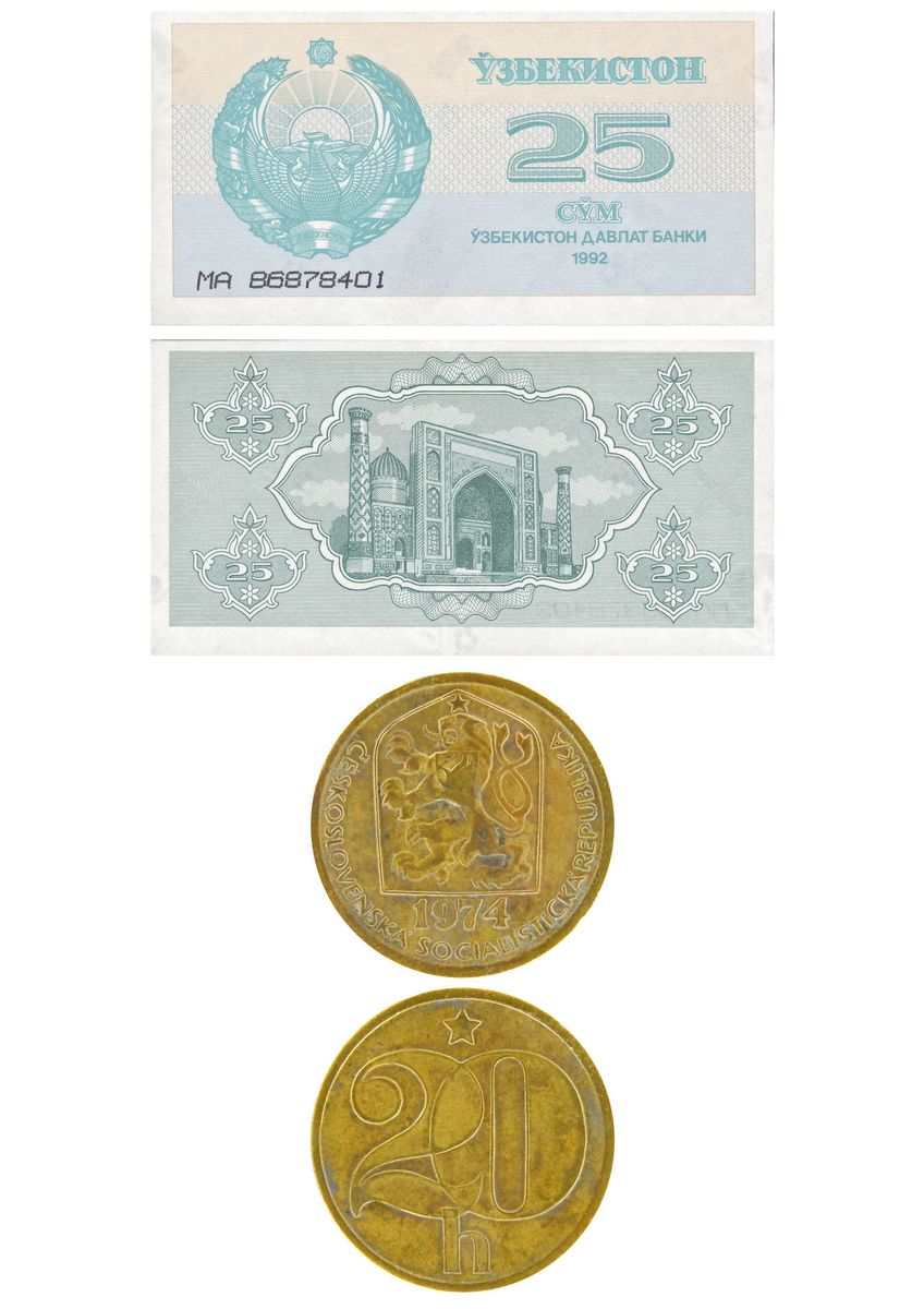 Вложение 25 сомов (Узбекистан ), 20 геллеров (Чехословакия )