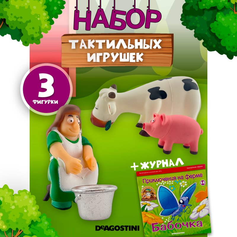 В комплекте вы получите журнал и набор игрушек: Василиса, ведро, скамеечка, корова, свинья. Симпатичные персонажи, забавные животные и детали для строительства твоей собственной фермы в новой коллекции «Животные на Ферме Василия и Василисы». Издательство ДеАгостини.С каждым выпуском коллекции твоя ферма будет пополняться новыми животными и различными постройками, а также огородом, прудом и другими обязательными для настоящей фермы деталями. Собери ферму со всеми её обитателями!Вместе с коллекцией забавных фигурок, созданных на основе рисунков из журнала, ты сможешь собрать свою собственную ферму с людьми, животными, обстановкой и даже необходимыми хозяйственными инструментами. Наши симпатичные персонажи, фермер Василий и его жена Василиса, а также собака Полкан, корова Зорька, бык Огонек, ослик Бублик и многие другие проводят тебя в познавательный мир интересных открытий и сюрпризов!Журнал Животные на Ферме расскажет об интересных фактах и увлекательных историях из жизни животных. Он красочно иллюстрирован тематическими картинками и содержит ответы на все вопросы, связанные с фермерской жизнью.