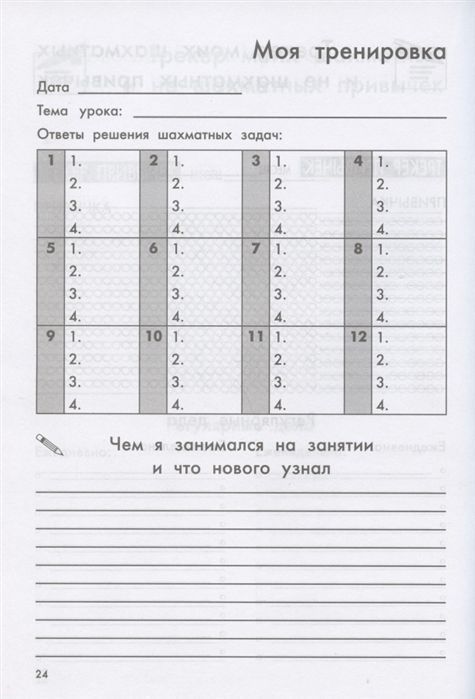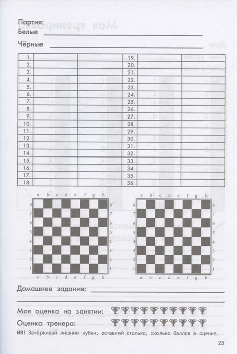Дорогой друг! Шахматы - это спорт. А в спорте, как известно, регулярные тренировки и участие в соревнованиях - залог успеха. Дневник, который ты держишь в руках, не только сохранит все твои сыгранные партии, но и поможет тебе приучиться регулярно решать шахматные задачки, читать шахматные книги и окажет помощь в тренировках. Великих шахматных свершений и красивых партий! В дневнике ты найдешь также поощряющие наклейки, которыми сможешь отмечать свои самые яркие победы и самые интересные и полезные знания, которые будешь получать на занятиях. Размещай их на полях дневника, и они будут служить тебе отличной памяткой.