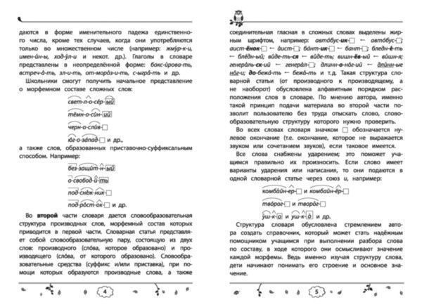 Морфемно-словообразовательный словарь включает более 3 000 слов. Основу словаря составила прежде всего общеупотребительная лексика, используемая в учебниках по русскому языку для начальной школы. В нём представлена морфемная и словообразовательная структура производных слов, относящихся к таким частям речи, как имя существительное, имя прилагательное, глагол и наречие. При составлении словаря использовался алфавитный принцип подачи материала. Словарь предназначен в первую очередь для младших школьников и учителей начальных классов общеобразовательных школ, гимназий.