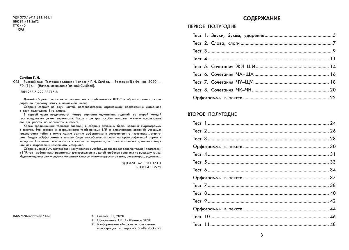 Данный сборник составлен в соответствии с требованиями ФГОС и образовательного стандарта по русскому языку в начальной школе. Сборник состоит из двух частей, последовательно отражающих прохождение материала в двух полугодиях 1-го класса. В первой части предлагаются четыре варианта однотипных заданий, во второй каждый тест представлен двумя вариантами. Такая структура пособия поможет учителю использовать его для работы по вариантам в классе. Кроме традиционных тестовых заданий, в сборник включены блоки заданий "Орфограммы в тексте". Это связано с современными требованиями ВПР и олимпиадных заданий: учащимся предлагается найти в тексте самые разные орфограммы в соответствии с изученным материалом. Раздел "Орфограммы в тексте" будет способствовать развитию орфографической зоркости учащихся. Его можно использовать в классе по вариантам, а также в качестве домашних заданий для закрепления изученного материала. Сборник может быть востребован как учителем в учебном процессе для дополнительной подготовки к ВПР, так и заботливыми родителями для восполнения у детей пробелов в знаниях по русскому языку. Издание адресовано учащимся начальных классов, учителям русского языка, репетиторам, родителям.