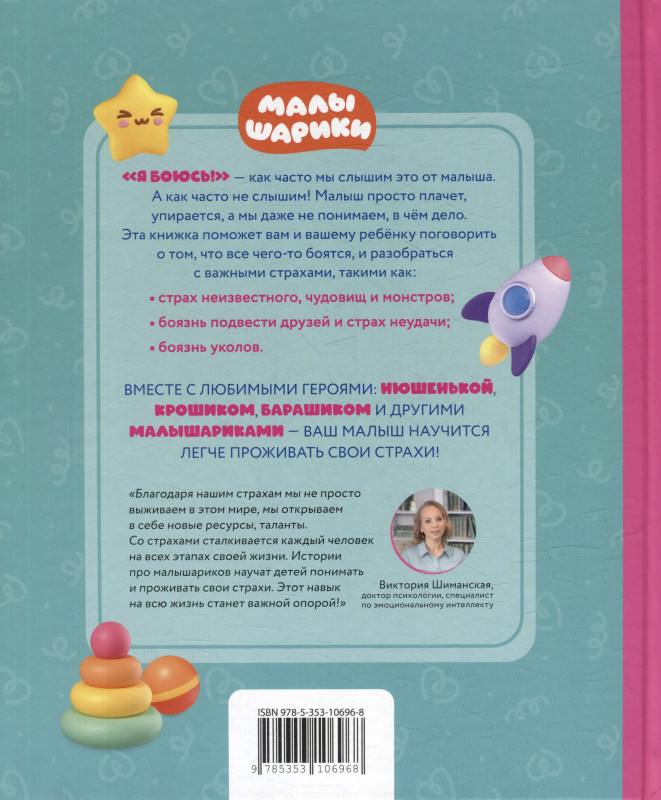 Страх — очень важная эмоция, с которой сталкивался каждый. Научиться проживать свой страх и становиться сильнее помогут истории в этой книжке. Вместе с малышариками ваш малыш узнает, что бояться — нормально, но страх можно прожить и, благодаря страху, даже научиться чему-то новому. А предисловие специалиста по эмоциональному интеллекту Виктории Шиманской подскажет родителям, как работать с книжкой и как действовать в ситуации, когда ребенок боится.