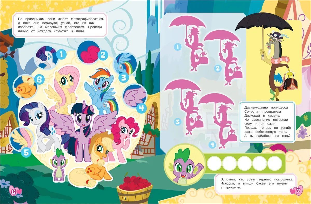 Цветная брошюра с интересными играми, раскрасками, увлекательными лабиринтами, головоломками и аппликациями по мотивам популярного мультсериала «Дружба - это чудо» (My Little Pony). Все необходимые для аппликации детали ребенок найдет внутри книжки.