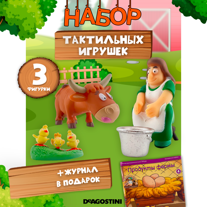 В комплекте вы получите журнал и набор игрушек: корова Буренка, цыплята, Василиса, ведро с молоком, скамейка. Симпатичные персонажи, забавные животные и детали для строительства твоей собственной фермы в новой коллекции «Животные на Ферме Василия и Василисы». Издательство ДеАгостини.С каждым выпуском коллекции твоя ферма будет пополняться новыми животными и различными постройками, а также огородом, прудом и другими обязательными для настоящей фермы деталями. Собери ферму со всеми её обитателями!Вместе с коллекцией забавных фигурок, созданных на основе рисунков из журнала, ты сможешь собрать свою собственную ферму с людьми, животными, обстановкой и даже необходимыми хозяйственными инструментами. Наши симпатичные персонажи, фермер Василий и его жена Василиса, а также собака Полкан, корова Зорька, бык Огонек, ослик Бублик и многие другие проводят тебя в познавательный мир интересных открытий и сюрпризов!Журнал Животные на Ферме расскажет об интересных фактах и увлекательных историях из жизни животных. Он красочно иллюстрирован тематическими картинками и содержит ответы на все вопросы, связанные с фермерской жизнью.