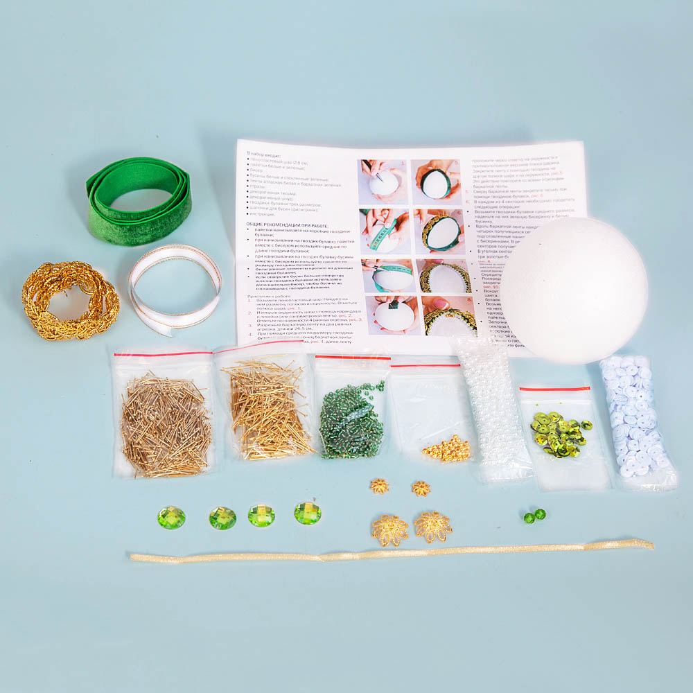 1.Пенопластовый шар дм 8. 2. Бархатная и атласная ленты, декоративная тесьма, шнур. 3. Пайетки, бусины, бисер. 4. Гвоздики-булавки. 5. Филигранные элементы. 6. Пошаговая инструкция с фото.