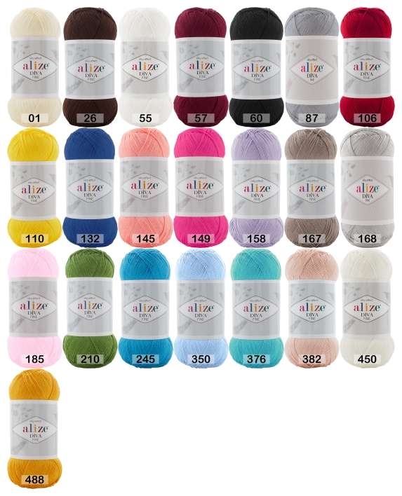 Ализе дива файн. Очень тонкая легкая шелковистая пряжа для весенних или летних вещей. Приятная на ощупь, гигроскопичная она подойдет для сарафанов, туник, платьев, легких костюмов, кофт, шалей и накидок. Пряжа не скатывается, не вызывает аллергию, не линяет и не оставляет ворсинок на другой одежде.