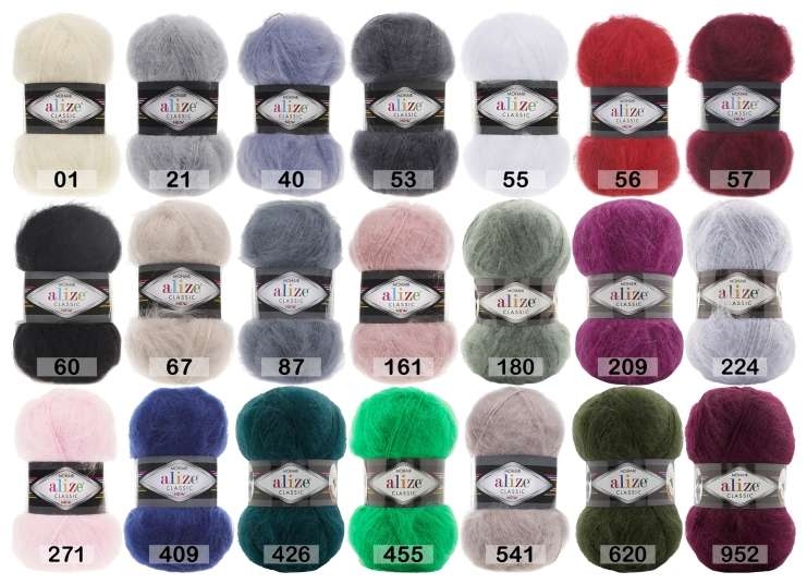 Ализе мохер классик нью. Пушистая, лёгкая и очень тёплая мохеровая пряжа. Подойдет для вязания ажурного палантина, шарфа, шапки, жилета, болеро, шали и д.р. При вязании изделия, данную пряжу можно сочетать с классической шерстяной или полушерстяной пряжей.