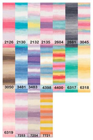 Красивая пряжа секционного крашения. Ниточка мягкая, приятная, держит форму, прекрасно подходит для вязания детских вещей. Производитель рекомендует спицы: 3-4, крючок 2-4.