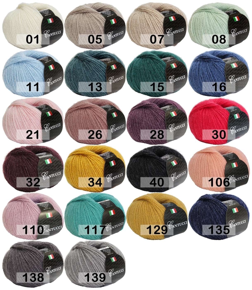 Итальянская пряжа Кантуччи изготовлена из мягкой мериносовой шерсти с добавлением акрила и вискозы. Нить свободно скручена, напоминает внешне шнурочек, в полотне виден деликатный пушок. Одной упаковки пряжи Кантуччи хватит для вязания джемпера или свитера 50-52 российского размера. Пряжа не колется, а цветовая палитра позволяет выбрать оттенок для взрослых и детей. Рекомендуемые спицы и крючок: 3,5-4,5 мм; машинное вязание.