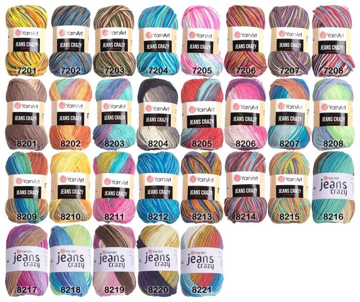 ЯрнАрт джинс крези. Аналог пряжи Jeans, но с принтованной окраской. Эти два артикула могут хорошо сочетаться в комплектах одежды. Подходят для вязания джемперов, кофточек, детской одежды.