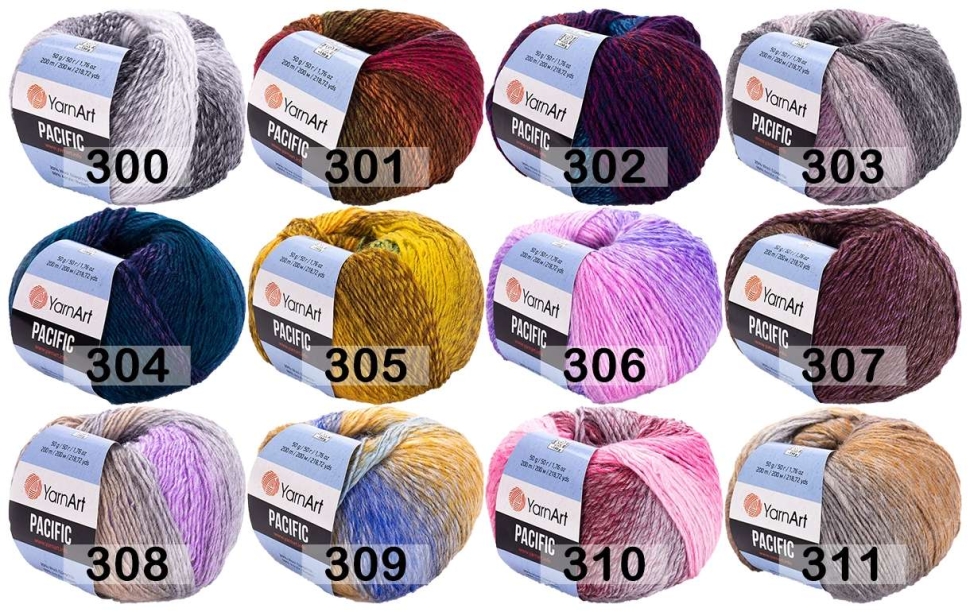 ЯрнАрт пасифик. Очень мягкая, нежная пряжа. Нить скручена из двух нитей разных оттенков, которые плавно сменяют друг друга, создавая красивый градиент. Производители рекомендуют спицы и крючок №3,5. На вязаном образце 10х10см получается 26 рядов по 38 петли.