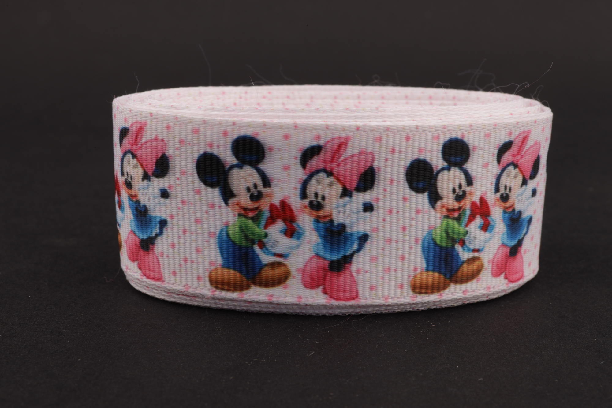 Купить репсовую ленту белого цвета с рисунком "Минни и Микки с подарком и нежно-розовый горох"(3D) Вы можете в нашем интернет-магазине lentoff.ru.