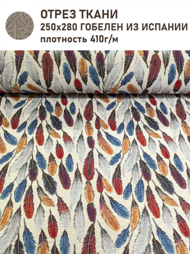Рисунок создается переплетением нитей различных цветов и фактуры. Состав ткани: хлопок ( дающий фактуру и приятную тактильность ) и синтетические нити ( придающие износостойкость ). Плотность гобелена 410 г на кв.метр.