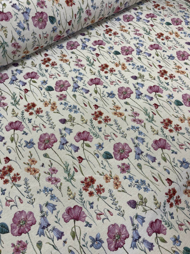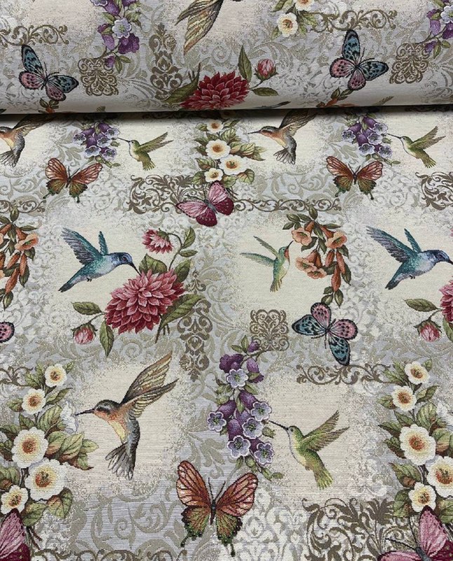 Рисунок создается переплетением нитей различных цветов и фактуры. Состав ткани: хлопок ( дающий фактуру и приятную тактильность ) и синтетические нити ( придающие износостойкость ). Плотность гобелена 410 г на кв.метр.