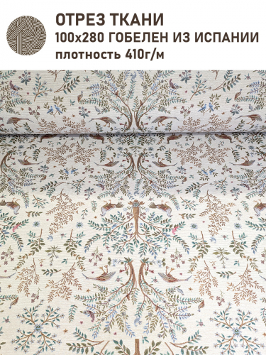 Рисунок создается переплетением нитей различных цветов и фактуры. Состав ткани: хлопок ( дающий фактуру и приятную тактильность ) и синтетические нити ( придающие износостойкость ). Плотность гобелена 410 г на кв.метр.