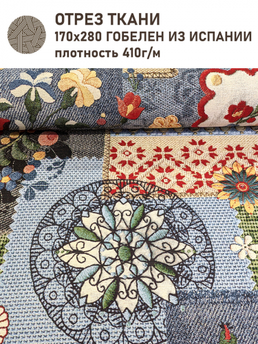 Рисунок создается переплетением нитей различных цветов и фактуры. Состав ткани: хлопок ( дающий фактуру и приятную тактильность ) и синтетические нити ( придающие износостойкость ). Плотность гобелена 410 г на кв.метр.