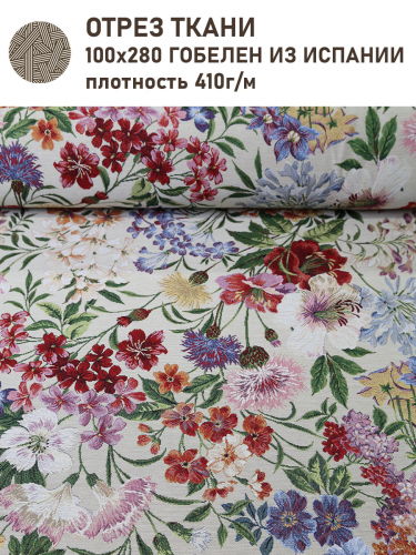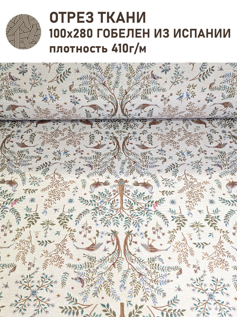 Рисунок создается переплетением нитей различных цветов и фактуры. Состав ткани: хлопок ( дающий фактуру и приятную тактильность ) и синтетические нити ( придающие износостойкость ). Плотность гобелена 410 г на кв.метр.