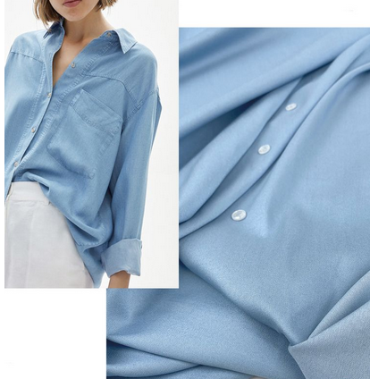 Тонкая, легкая джинсовая ткань с содержанием вискозы, придающей особую мягкость материалу. Имеет хорошую способность впитывать и отводить влагу. Эластичная, обеспечивает безупречную посадку по фигуре и комфорт в носке. Изделия из джинсовой ткани с добавлением полиэстера в составе требуют менее аккуратного ухода, они меньше мнутся и легче стираются. Предназначена для пошива летних брюк, юбок и платьев, рубашек. Рекомендуется перед шитьем провести противоусадочную обработку ткани, так как она может дать усадку около 7% по длине и ширине полотна.
