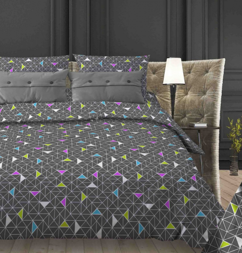 Эта стильная ткань с уникальным геометрическим узором в виде треугольников на темно-сером фоне станет отличным выбором для создания уютных и современных интерьеров. Яркие акценты в виде фиолетовых, зеленых и голубых треугольников добавляют оригинальности и динамики, делая материал идеальным для разнообразных проектов.
