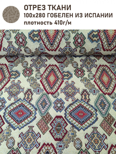 Рисунок создается переплетением нитей различных цветов и фактуры. Состав ткани: хлопок ( дающий фактуру и приятную тактильность ) и синтетические нити ( придающие износостойкость ). Плотность гобелена 410 г на кв.метр.