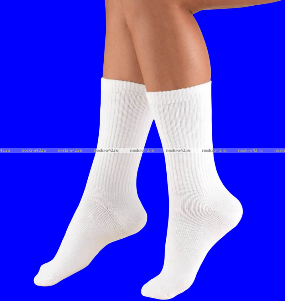 Белые носки с высокой резинкой подойдут на женскую и мужскую ногу.