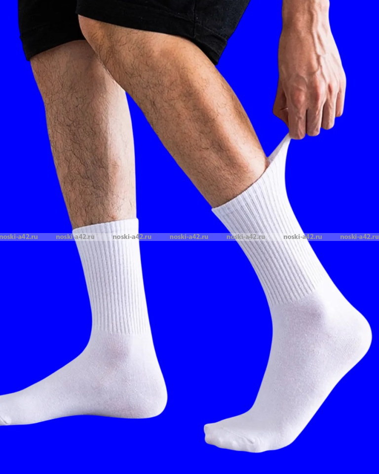Белые носки с высокой резинкой подойдут на женскую и мужскую ногу.