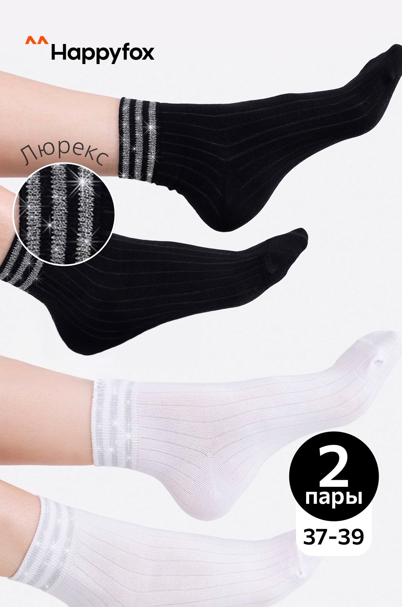 Демисезонные носки идеальны для лета и весенних дней. Носки для девушек подойдут для повседневных прогулок. ков из 2 пар выполнен из нежного хлопкового трикотажа. В комплекте черные и белые носки в рубчик. Блестящие полоски из люрекса добавляют изысканности.