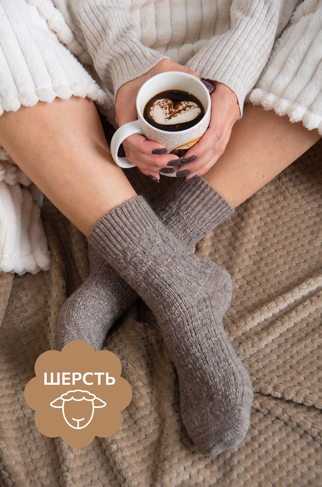 Шерстяные носки станут приятным дополнением к подарку на Новый год или Рождество! носки выполнены из приятной к телу пряжи с добавлением натуральной шерсти. Однотонные высокие носки бежевого цвета идеальны для уютных осенних вечеров в компании пледа и какао.