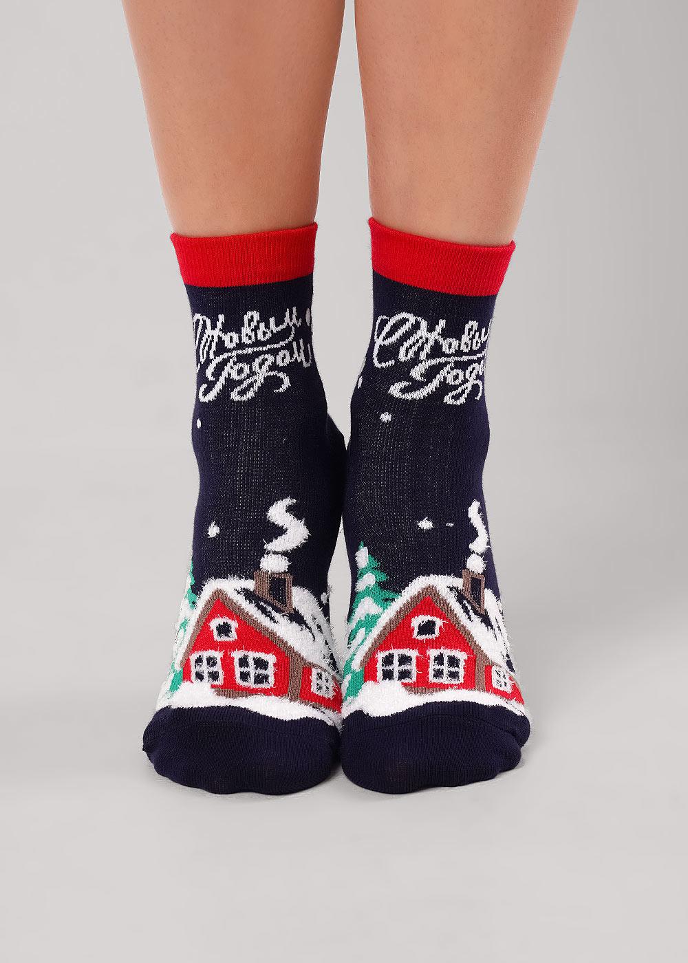 Описание: Носки женские с рисунком дом в зимнем лесу, снег выполнен из пряжи травка, и надписью С Новым годом!