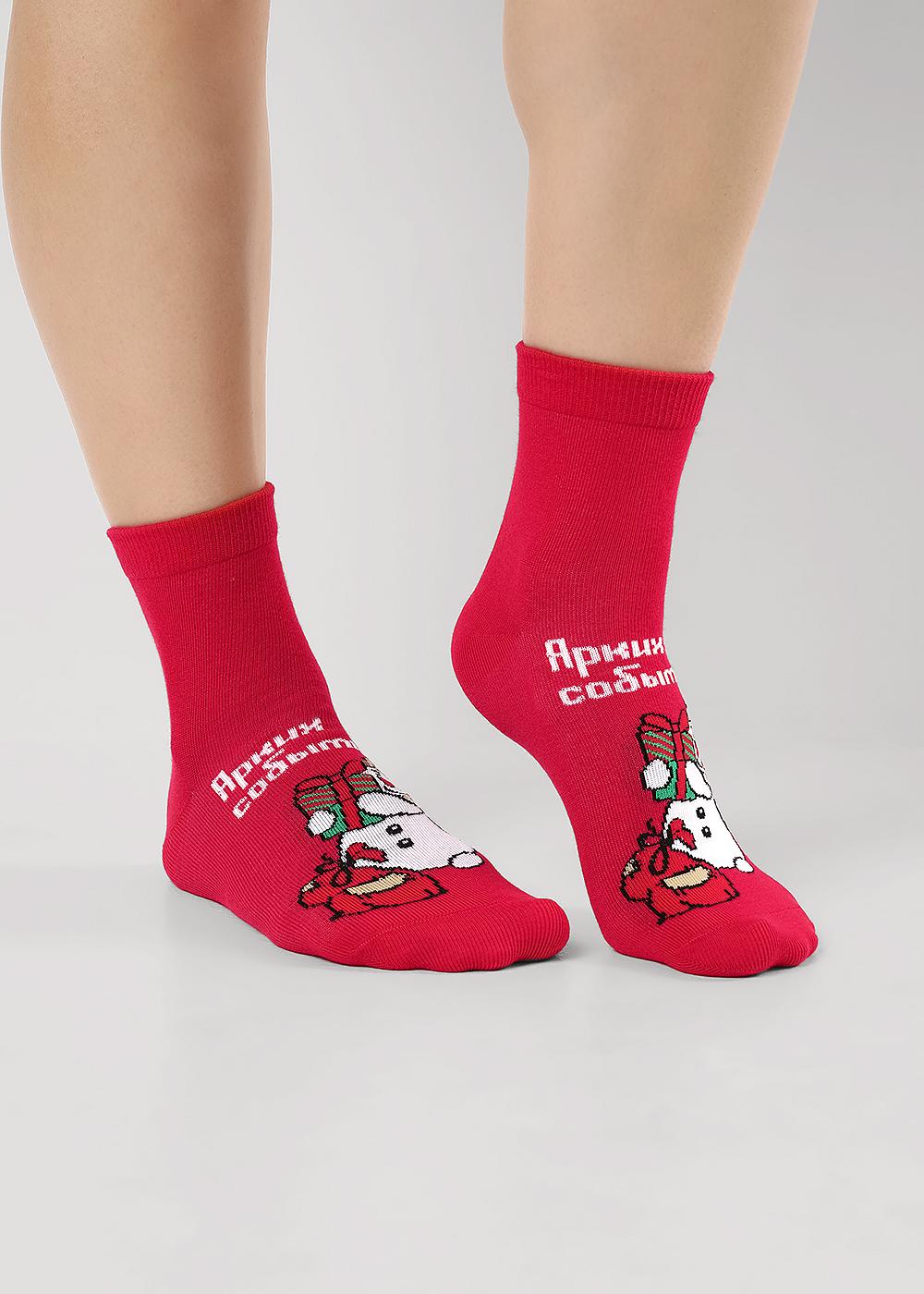 Описание: Носки женские с рисунком Снеговик с подарками и надписью Ярких событий!