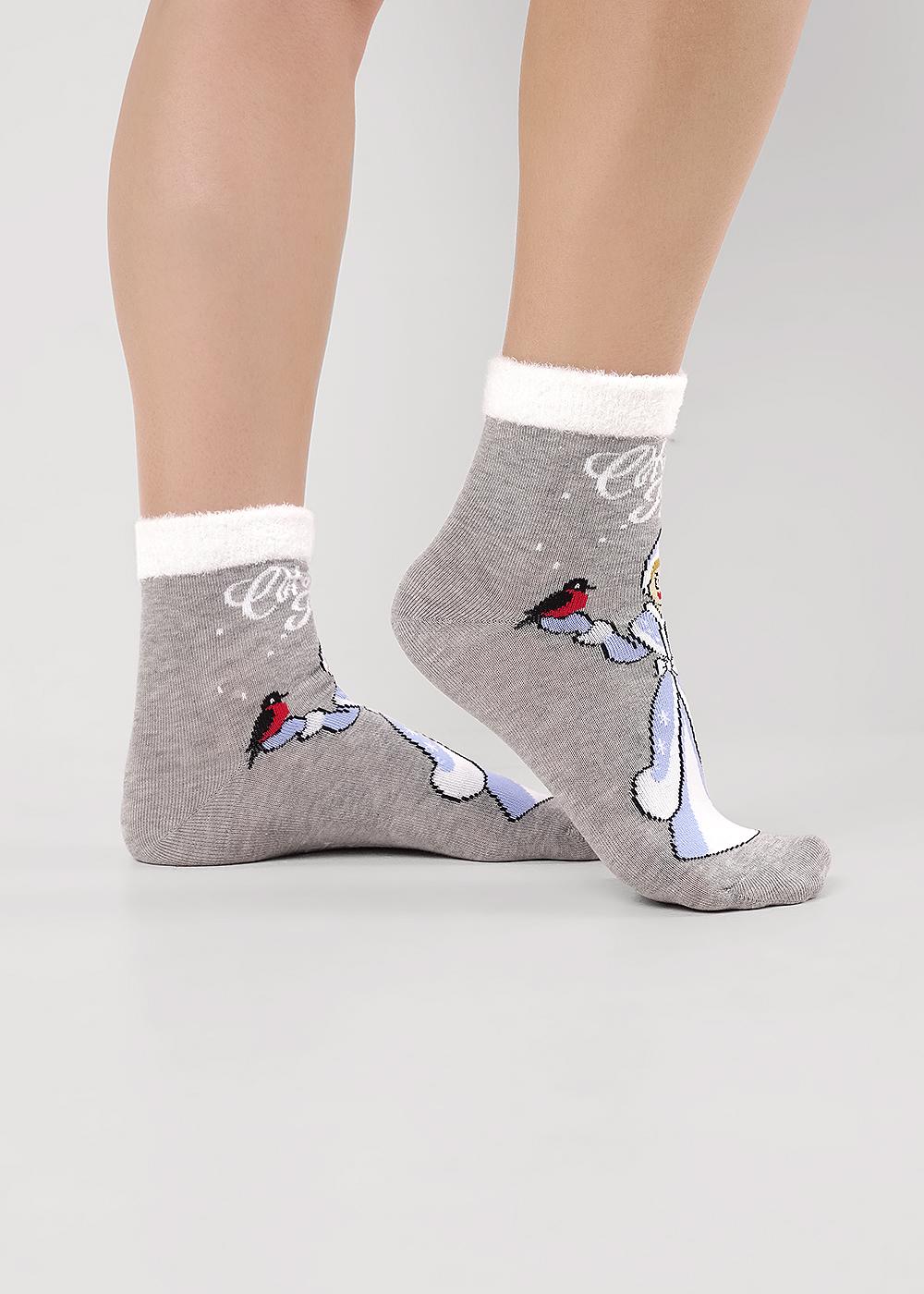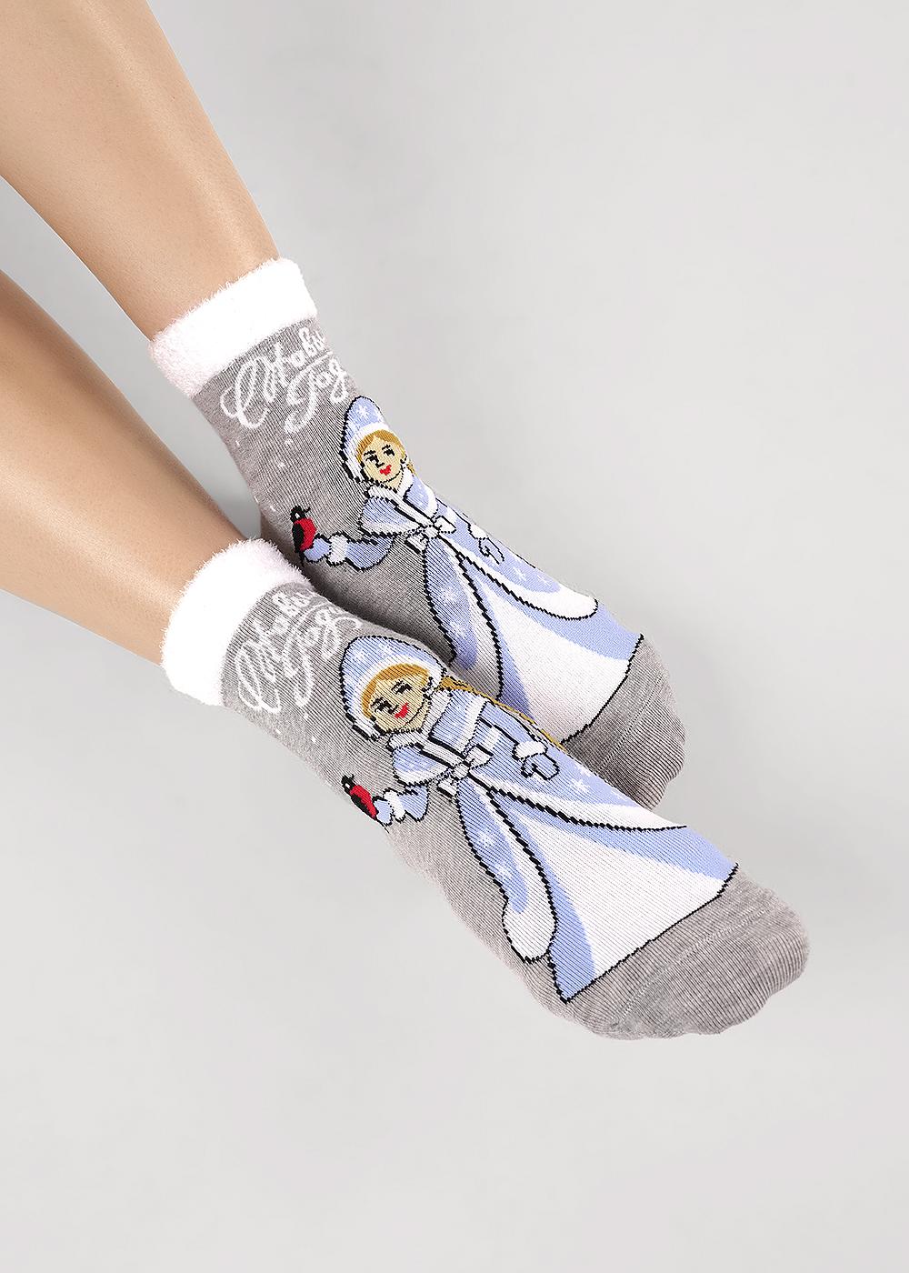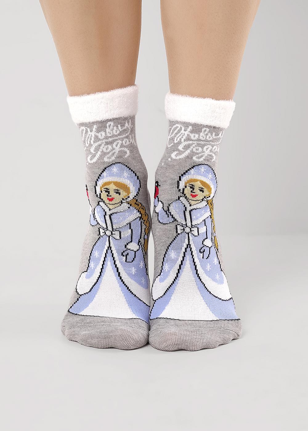 Описание: женские носки с рисунком снегурочки, надписью веселого нового года, борт выполнен из пряжи травка