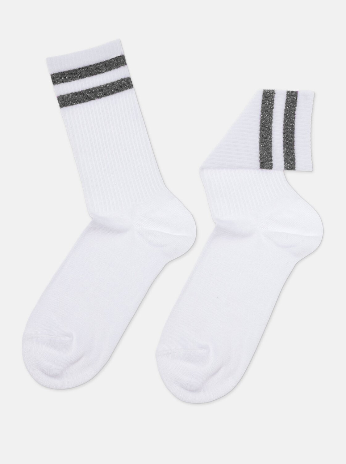 Хлопковые носки с яркими полосками из люрекса смотрятся так стильно и оригинально, что вам не захочется прятать их под одеждой. Смело носите трендовые носочки ACTIVE в стиле спорт-шик и с удовольствием подчеркивайте свою индивидуальность.