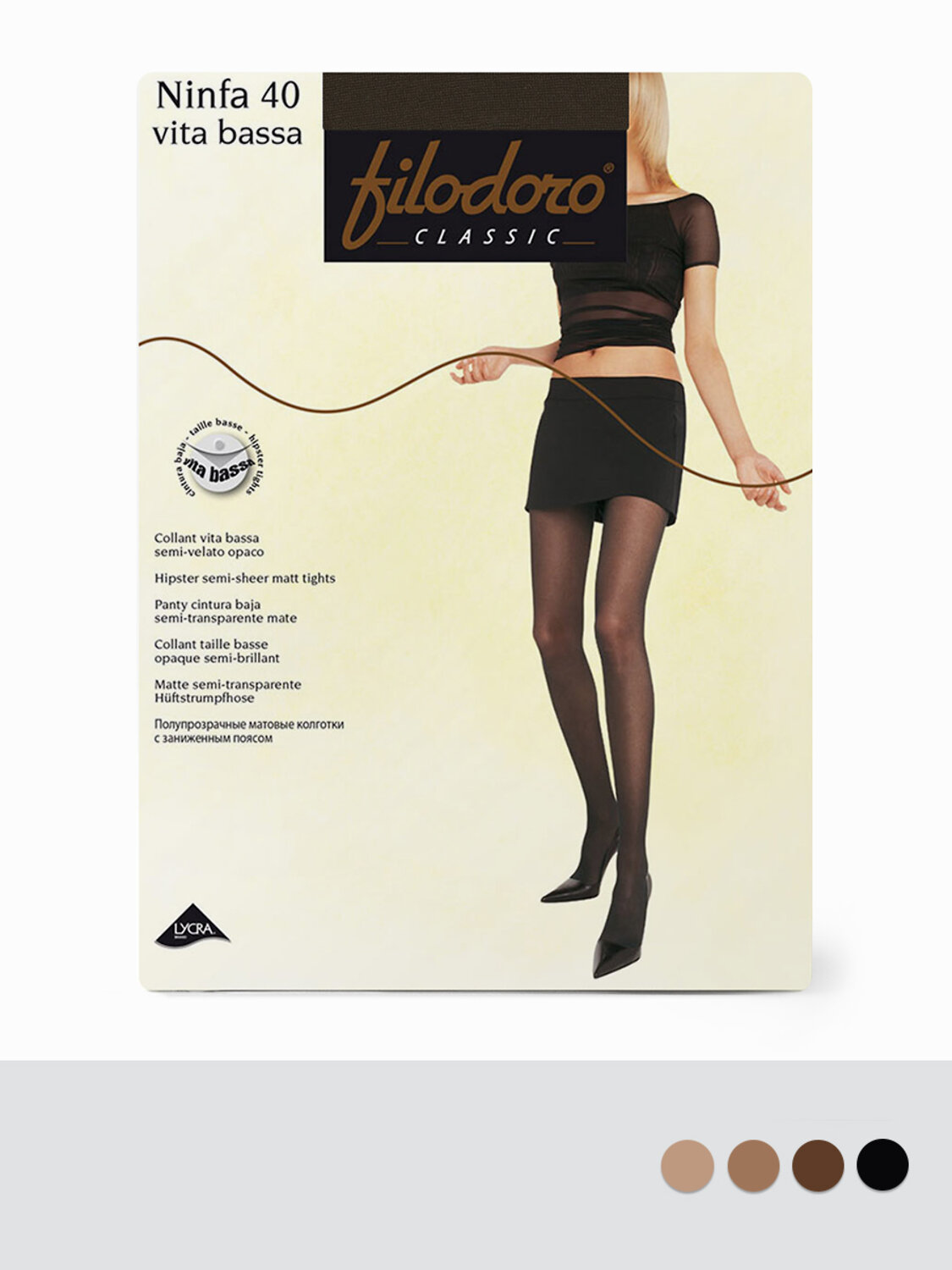 Матовые эластичные колготки 40 DEN, однородные по всей длине, с заниженной талией, гигиеничной ластовицей и невидимым мыском.