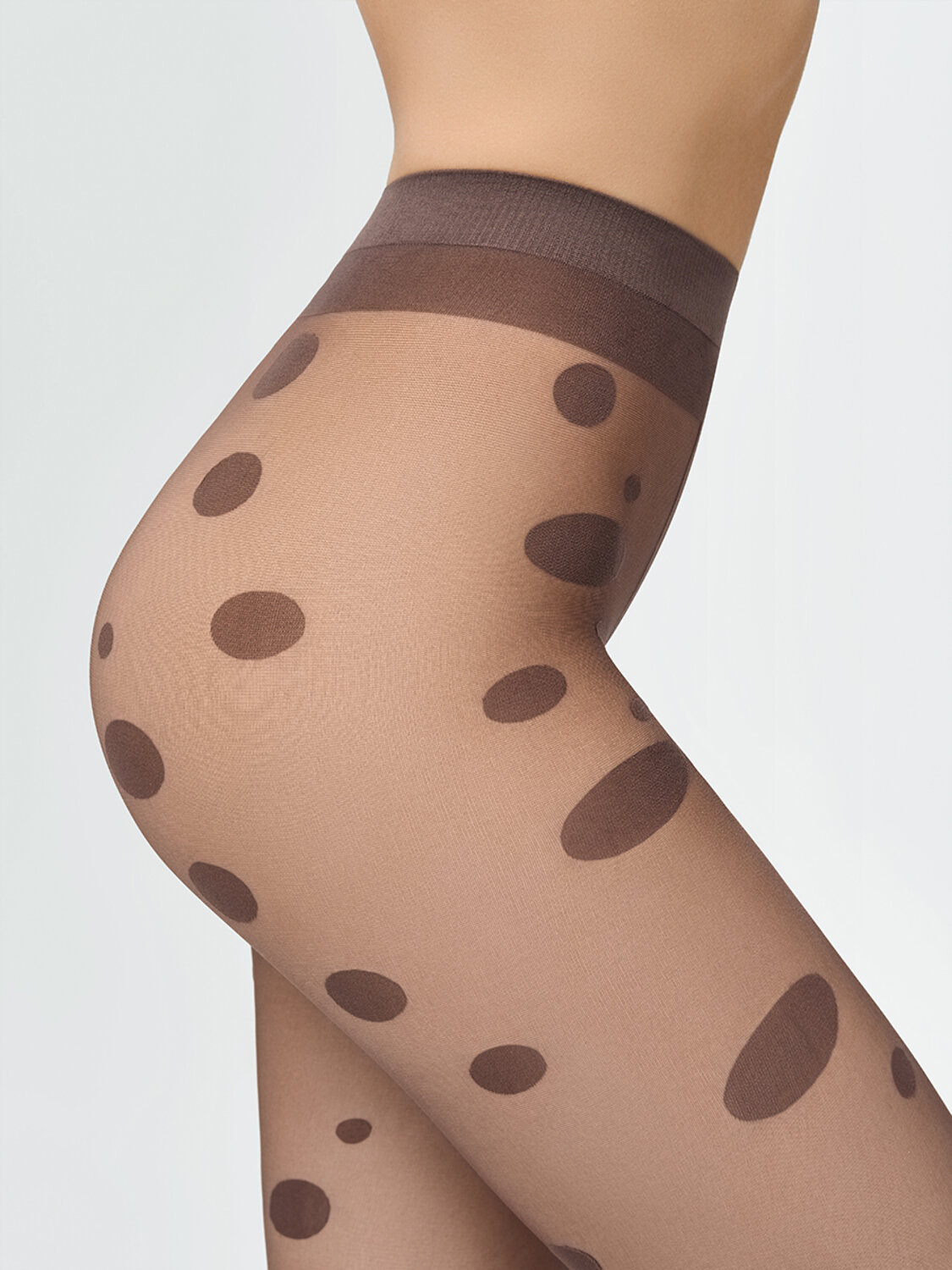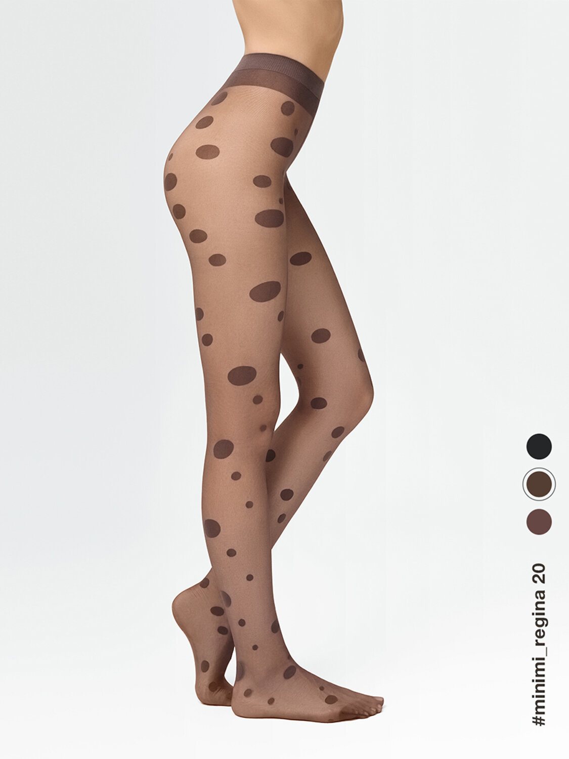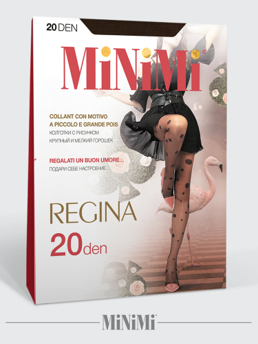 Женские эластичные колготки 20 den в горошек разного размера. Благодаря отсутствию шортиков колготки идеально сочетаются с короткими платьями, юбками и шортами. Гигиеничная хлопковая ластовица, удобный пояс и плоские швы создают дополнительный комфорт. Эластан в составе обеспечивает оптимальное облегание. Невидимый мысок позволяет носить Regina 20 с открытой обувью.