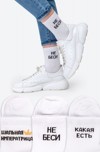 Вывязанные надписи делают образ стильным и характерным. Комплект носков из 3 пар подойдет женщинам и девочкам-подросткам. Трикотажные носочки нежно облегают ноги и не сползают при активных движениях благодаря плотной вязке. Демисезонные носочки из трикотажа для девушек будут отлично смотреться в тандеме с домашними тапочками.
