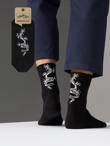Носки унисекс OMSA с рисунком в виде дракона на резинке. Изготовлены из мягкого хлопка, который обладает высокой воздухопроницаемостью, хорошо впитывает влагу, приятно ощущается и подходит даже для самой чувствительной кожи. Добавление эластана обеспечивает идеальное облегание, полиамид увеличивает износостойкость и прочность. Кеттельный (плоский) шов на мыске создает максимальный комфорт.