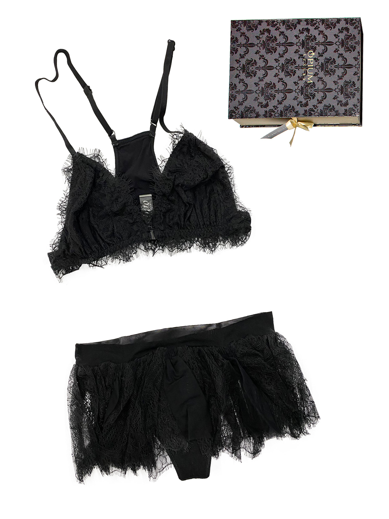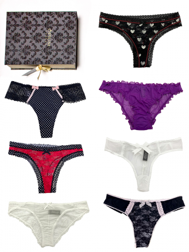 Богатый подарок в шикарной упаковке понравится любой девушке. В коробке, напоминающей драгоценную шкатулку, бережно упакован комплект нижнего белья: комплект из утонченного ажурного кружева включает эффектный бюст и игривую юбочку-стринги. Порадуйте себя любимую или близкого человека роскошным презентом.