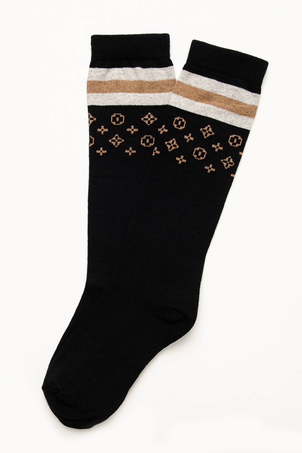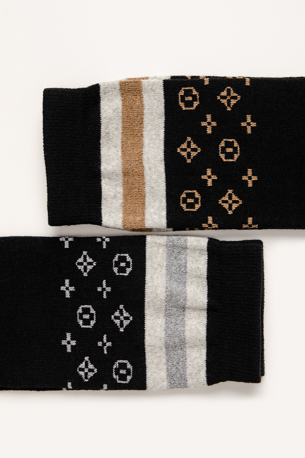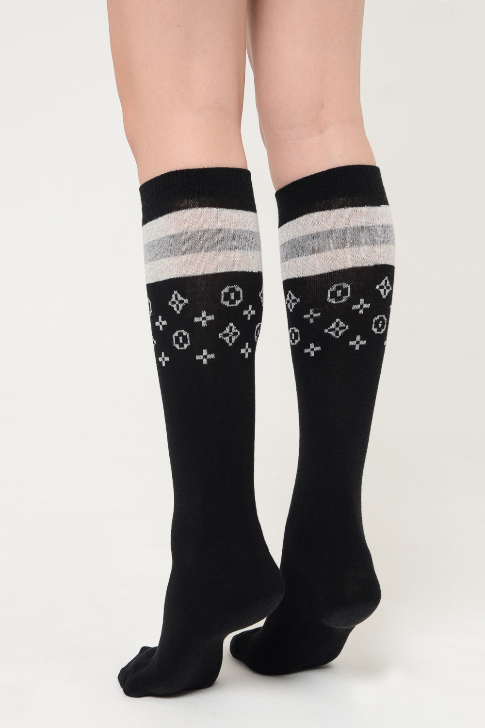 Стильные женские гольфы с лаконичным рисунком. В упаковке 2 пары с рисунками разных расцветок - бежевого и коричневого Расцветка: черный (ед.); Состав: 47% х/б 31% ПЭ 20% ПА 2% эластан.