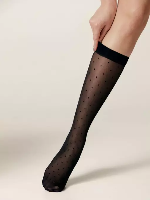 Плотные эластичные гольфы DOTS станут стильной альтернативой классическим однотонным моделям. 40 den, тонкие и эластичные, рисунок «точки», однородные по всей длине, без пятки, с бортом, созданы для стильных образов. полиамид 87%/ эластан 13%