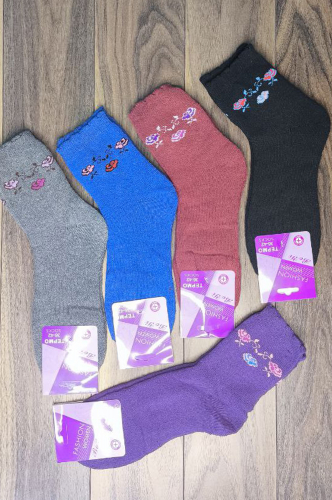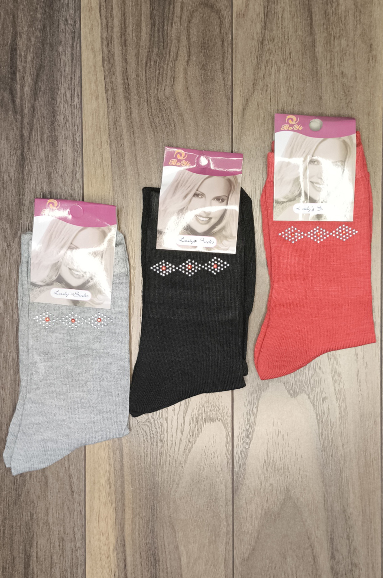 Хлопковые женские носочки классической высоты, на паголенке рисунок из страз, эластичная упругая резиночка. Модель из хлопка с добавлением пэ нити. Производство Китай.