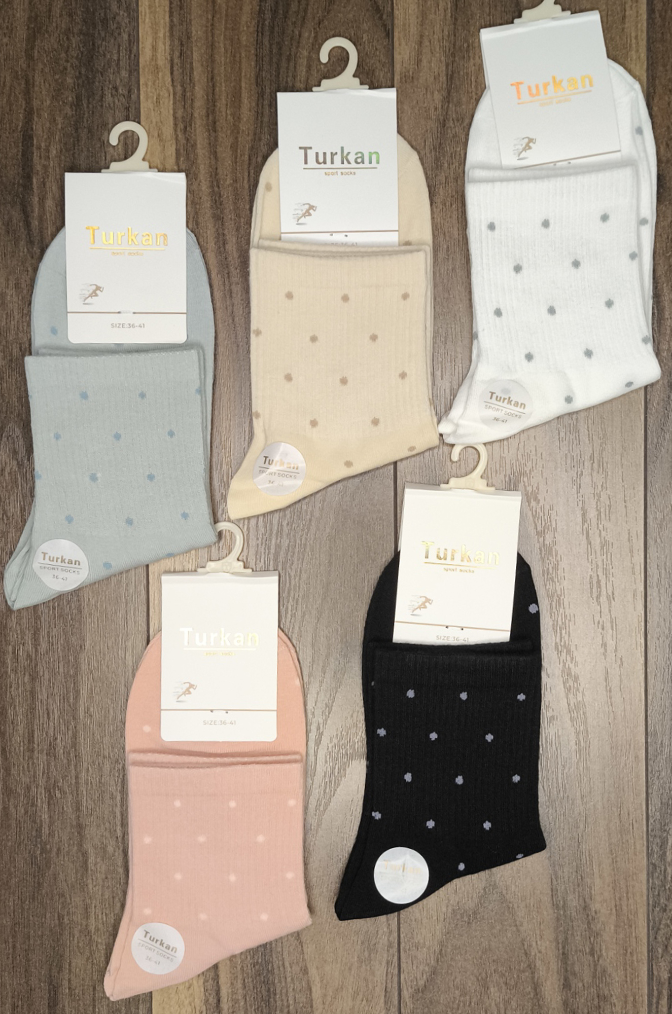 Хлопковые женские носочки средней высоты с прином "горошек". Широкий манжет "в рубчик" отлично держит носок по ножке. Производство фабричный Китай.