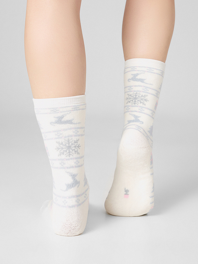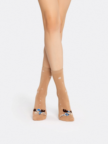 рис.1792 Женские махровые классические носки с рисунком в виде оленей, подарков и елочек.