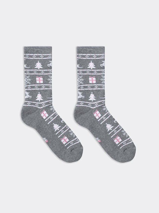 Махровые женские носки с узором в виде оленей — незаменимая вещь в гардеробе, самостоятельный стильный атрибут и возможность расставить акценты в любом образе. Они выполнены из гребенного хлопка — пряжи высочайшего качества, прочной и долговечной. Натуральные волокна отлично пропускают воздух, позволяя коже дышать, и впитывают влагу, поэтому носочки дарят ощущение комфорта в течение всего дня. Пятка и мысок усилены для защиты от протирания. Мягкая эластичная резинка не препятствует кровообращению и равномерно распределяет давление: носки надежно держатся на ноге и не сползают.