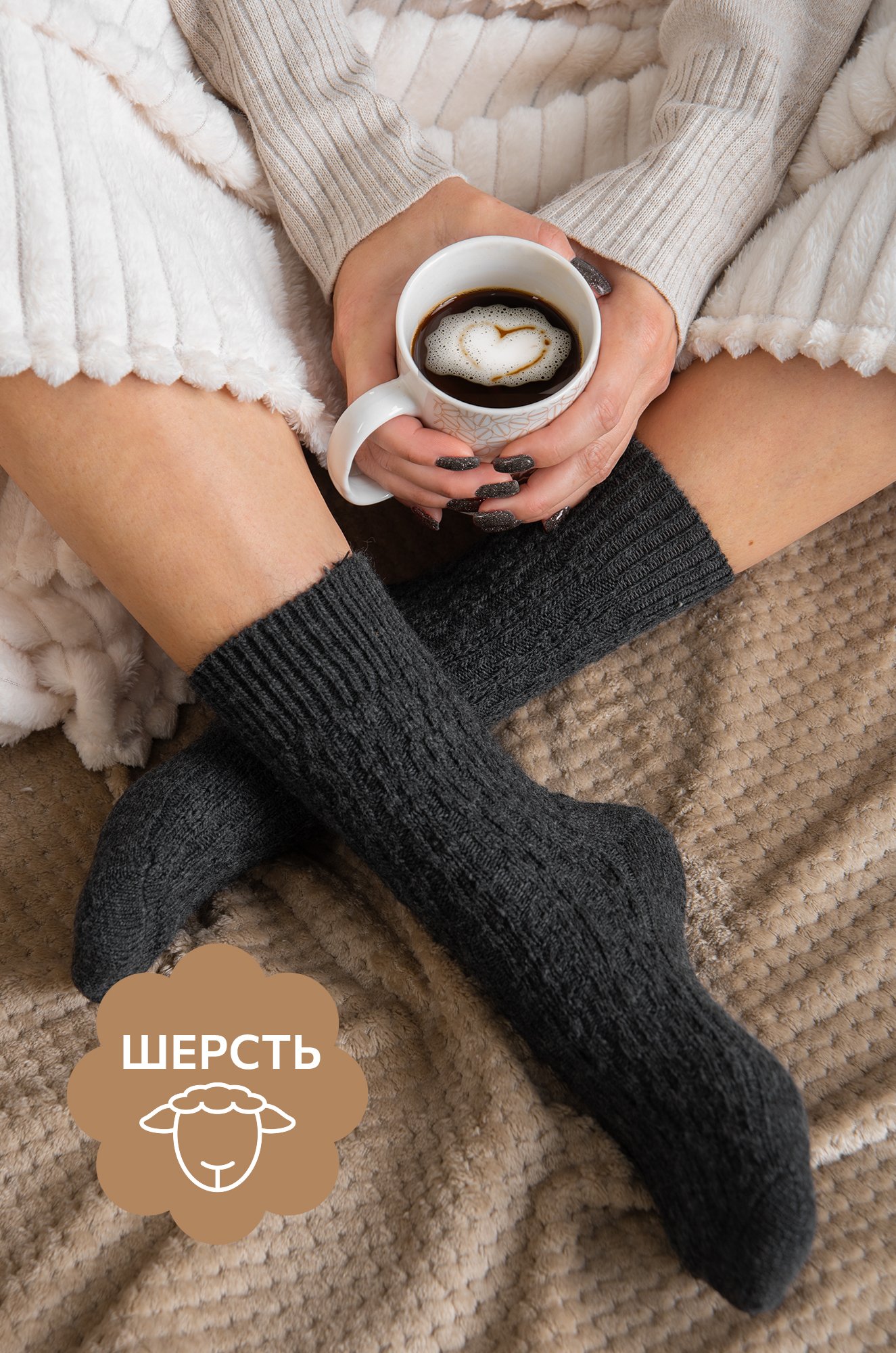 Шерстяные носки станут приятным дополнением к подарку на Новый год или Рождество! носки выполнены из приятной к телу пряжи с добавлением натуральной шерсти. Однотонные высокие носки темно-серого цвета идеальны для уютных осенних вечеров в компании пледа и какао.