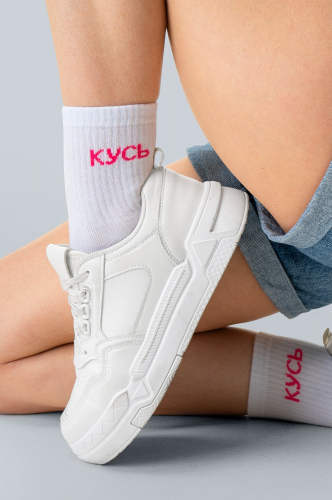 Белые женские носки выполнены из натур..показатьального хлопка и украшены прикольной надписью За деньги да.