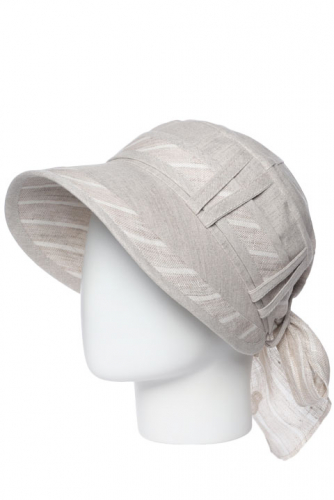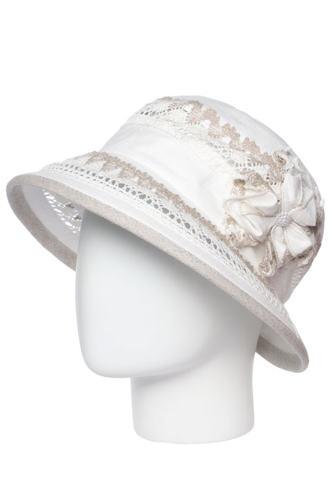 Панама женская выполнена из льняной ткани и хлопкового кружева. Поля небольшие 7,5 см, по краю усилены каркасом, благодаря чему хорошо держат форму. Регулятором размера служат завязки сзади панамы.