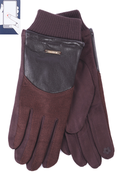 Перчатки женские сенсорные (нашивка на кончике указательного пальца). Комбинированные: ладонь иск.замша на велюровой основе. Сверху - трикотаж на подкладе велюр и вставка из эко-кожи.