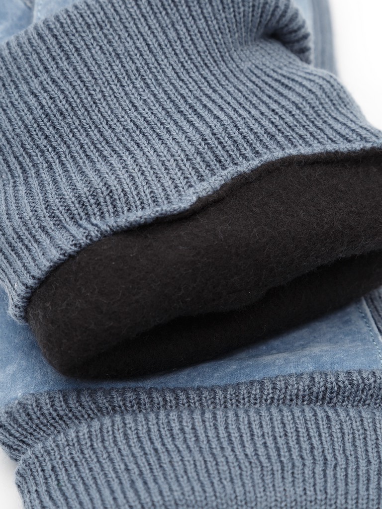 Перчатки торговой марки MODO изготовлены из натуральной кожи (велюр) и трикотажа. Состав трикотажа: 100% акрил. Подкладка - флис, утеплитель - Thinsulate. На ладонной стороне резинка. Длина манжеты от нижней точки большого пальца до края перчатки - 2,5 см. Длина пальцев - средняя.