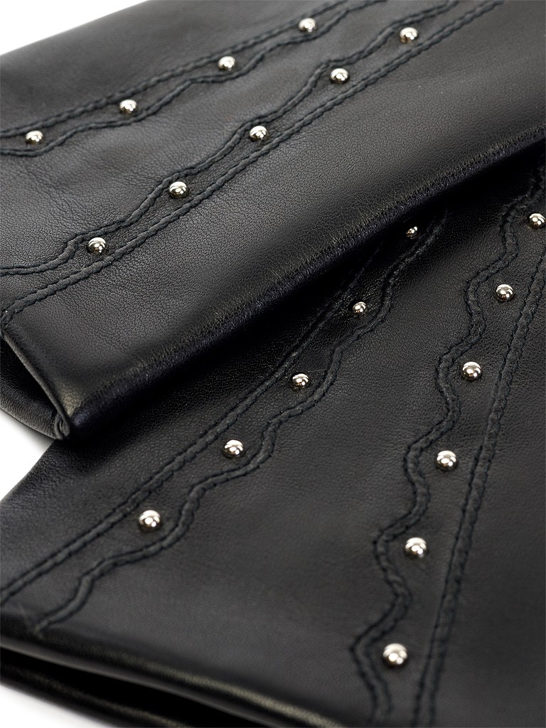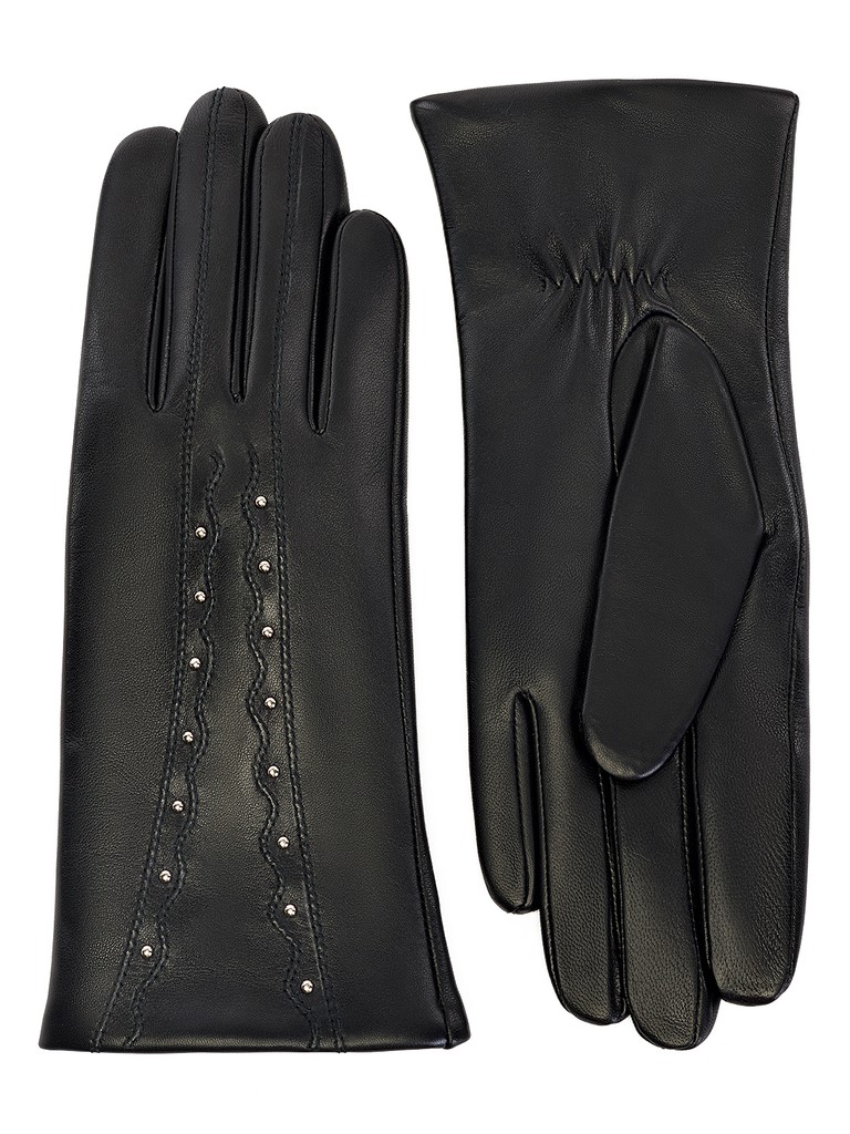 Перчатки женские торговой марки LABBRA производства Китай. Выполнены из натуральной кожи ягненка. Подкладка - 70% шерсть, 30% акрил. Отделка в форме вертикальной волнообразной декоративной отстрочки, украшенной металлическими хольнитенами. Резинка на ладонной стороне манжеты. Длина манжеты от нижней точки большого пальца до края перчаток - 6 см. Длина пальцев - средняя.