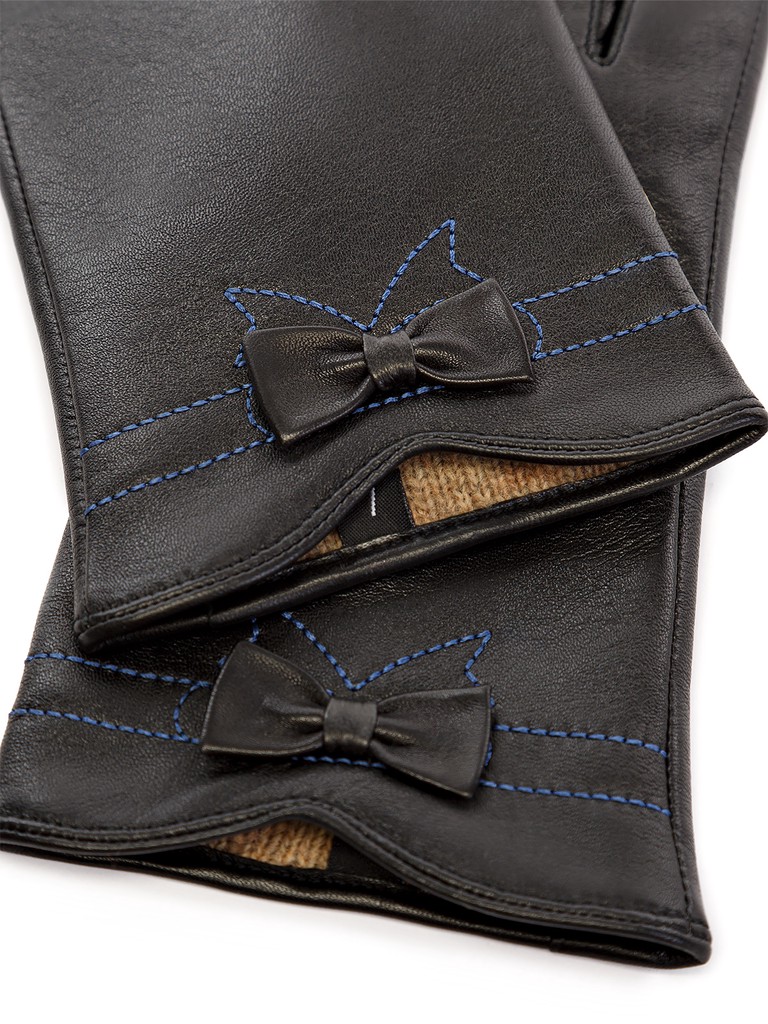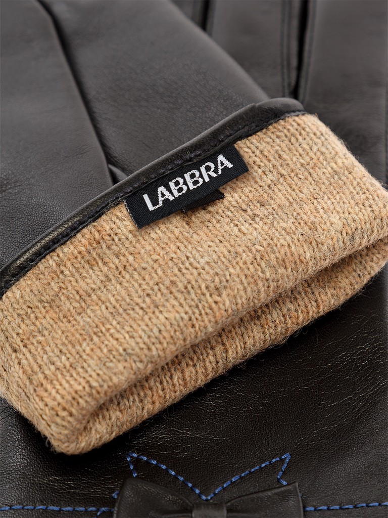 Перчатки женские торговой марки LABBRA производства Китай. Выполнены из натуральной кожи ягненка. Подкладка - 70% шерсть, 30% акрил. Отделка - отстрочка ниткой контрастного цвета в форме банта.  Длина манжеты от нижней точки большого пальца до края перчаток - 5 см. Длина пальцев - средняя.